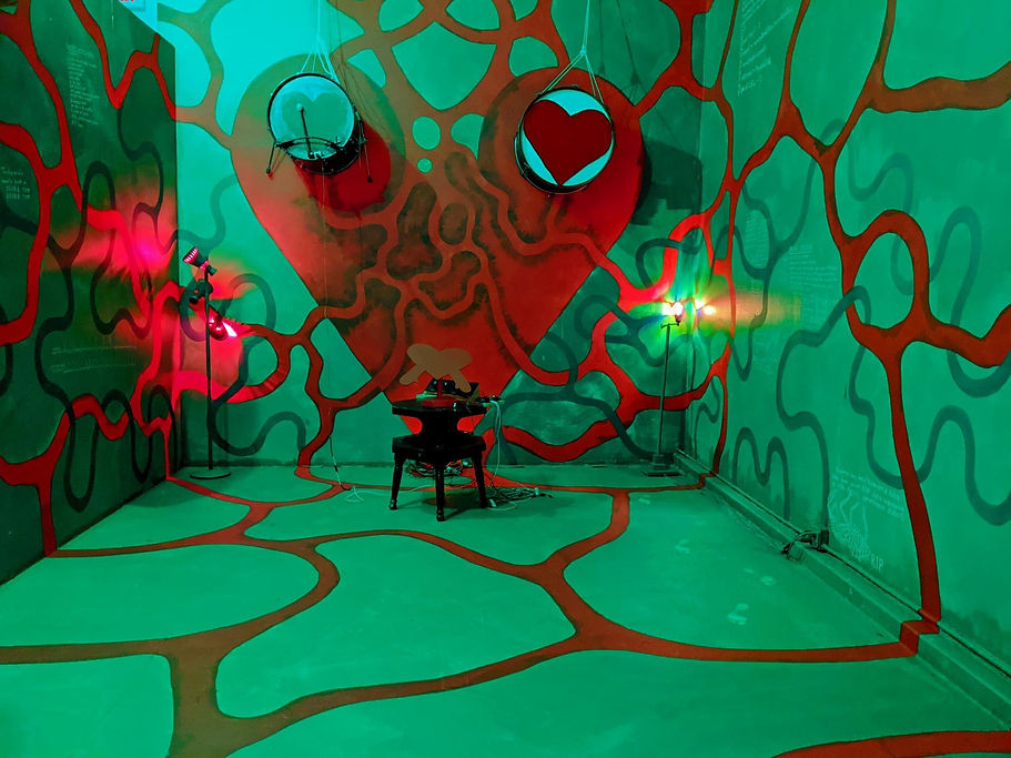 During the installation segment, viewers were able to place their own fingertips on the sensors and hear their heartbeats pounding on a bass drum above their heads. There was chamomile and cayenne tea to slow down heart rates or cookies if you wanted to speed it up. At the end of the exhibition we also performed a rehearsed piece with the drums (although sadly the motors burnt out just before the show and we were reduced to a drummer taking his own heart beat in real time and working with that).